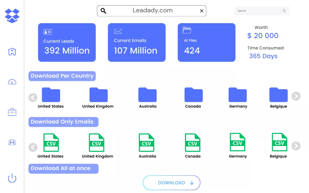 As we are in our beta stage and our web application is still under development, we couldn’t host our database locally due to its vast size, totaling more than 100 GB, split into multiple files. That’s why we decided to partner with Dropbox.com, one of the leading file hosting services in the world, so once the order is completed, you will receive a Dropbox account link to access our extensive database without any limits, enabling you to hunt leads with absolute freedom and no restrictions.